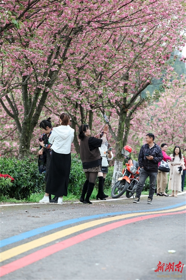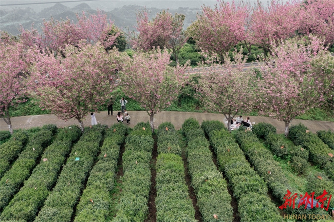 Currently, cherry blossoms are in full bloom at the Niujiao Mountain Tea Garden in Morong Town, Guzhang County. The tea plantation, dressed in vibrant green, attracts many visitors who come to enjoy the spring scenery and savor the cozy spring moments. (Photo/Zhang Shujie)
