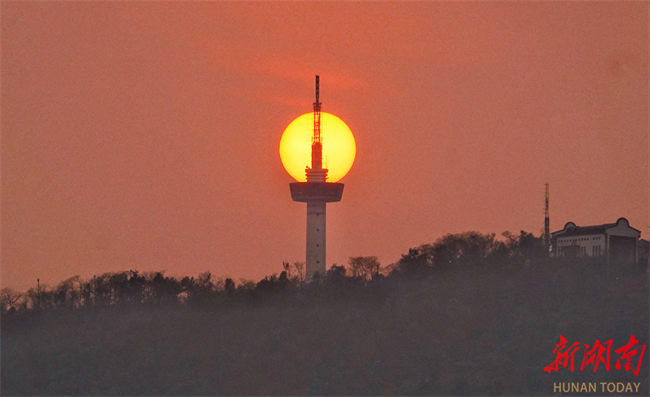 The fiery sunset contrasts beautifully with the silhouette of the "Eye of Changsha," the Changsha Radio and Television Tower atop the Yuelu Mountain. (Photo/Xu Xing, Hunan Daily)