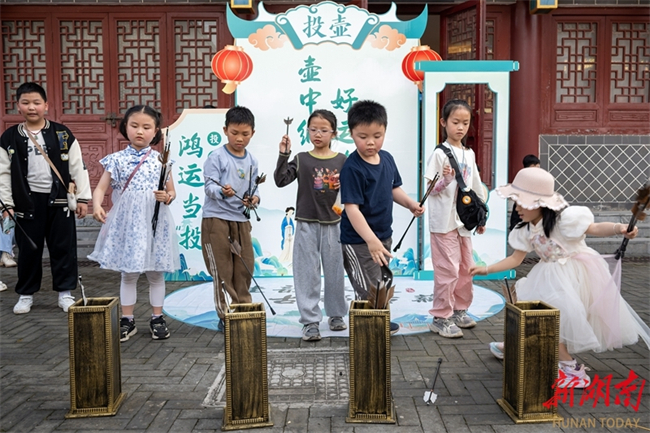 The 2026 Guiyang County Folk Culture Performance officially kicked off on April 19. The event included a "San Yue San (the third day of the third Chinese lunar month)" Song Festival, opera performances, dragon and lion dances, among other activities, allowing visitors to immerse themselves in the unique charm of folk culture. The photo shows kids experiencing Touhu game, or Pitch-pot, on that day. (Photo/Ouyang Changhai)