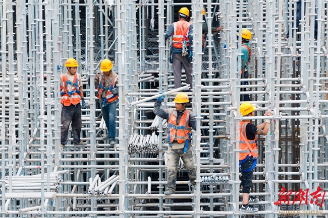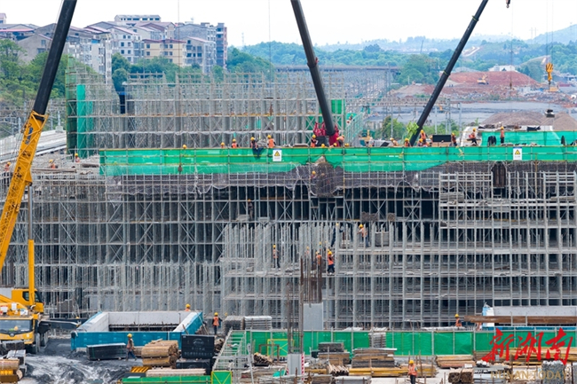 The photo, taken on April 23, shows workers busy constructing the main structure of the railway station waiting hall, a part of the renovation project for the Yongzhou Railway Station on Shaoyang-Yongzhou High-speed Railway. The project, undertaken by the Shanghai-Kunming Passenger Dedicated Line Hunan Company and China Railway Construction Group Co., Ltd., is a critical control project for the Shaoyong High-speed Railway. The station scale will be expanded from three platforms with 13 tracks to six platforms with 18 tracks. Once completed, the Yongzhou Railway Station will become a comprehensive transportation hub connecting Shaoyang-Yongzhou High-speed Railway, Hengyang-Liuzhou Railway, and the planned Guangzhou-Qingyuan-Yongzhou High-speed Railway, facilitating high-speed rail link between southern Hunan and the Guangdong-Hong Kong-Macao Greater Bay Area. (Photo/Lei Zhongxiang and Jiang Lingzhi)