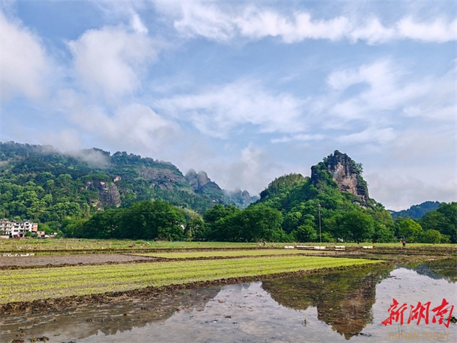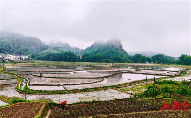 The photo, taken on April 24, shows farmers busy working in paddy fields at the foot of Langshan Mountain in Xinning County. They bend over the paddies against the backdrop of peak clusters shrouded by clouds and mist, forming a vibrant pastoral landscape. (Photo/Yan Yuebin)