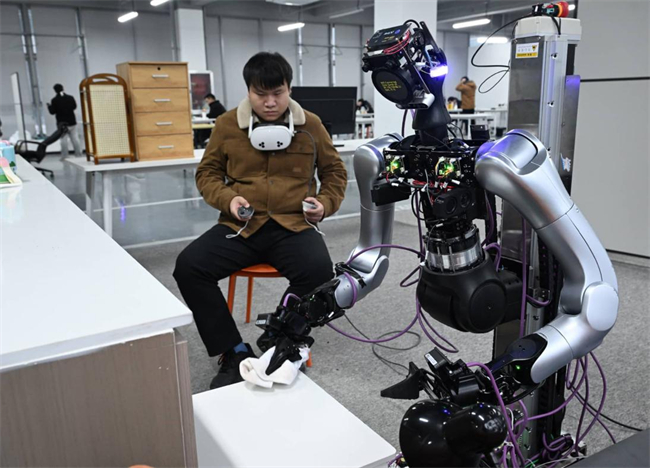 An engineer trains a robot in a robot data collection center in Hefei, east China's Anhui province. (Photo/Zhang Dagang)