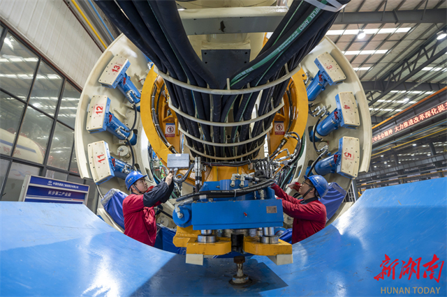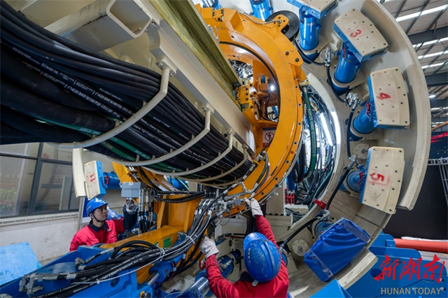 On February 17, workers debug the shield tunneling machine "No.1 Shuangjing". The machine, with an excavation diameter of 4.48 meters, rolled off the production line at the Second Industrial Park of the China Railway Construction Heavy Industry Corporation Limited (CRCHI) in Changsha on the same day. Jointly developed by CRCHI and the Sinohydro Engineering 9th Bureau Co., Ltd., it will be used for the construction of the Tina River Hydropower Development Project of Solomon Islands. This marks the first time a domestically-produced shield tunneling machine of China has been exported to the Solomon Islands. (Photo/Gu Pengbo, Hunan Daily)