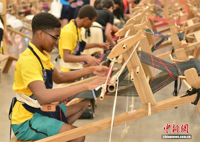 Foreign tourists try their hand at making Tujia brocade products at the Guaiyaomei Tujia Brocade Cultural Creative Park in Zhangjiajie. (Photo/Zhou Jing)