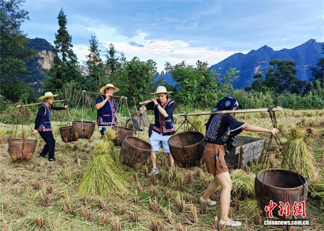 An American visitor and his companions recently immersed themselves in traditional farming activities at a homestay in Wulingyuan District, Zhangjiajie City in Hunan Province, adding a unique flavor to their trip. They tried their hand at harvesting, threshing, winnowing, and carrying rice.