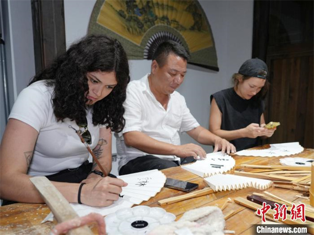 The photo shows foreign photographers trying their hand at making Yuezhou fans. (Photo/Yang Huafeng, Chinanews)