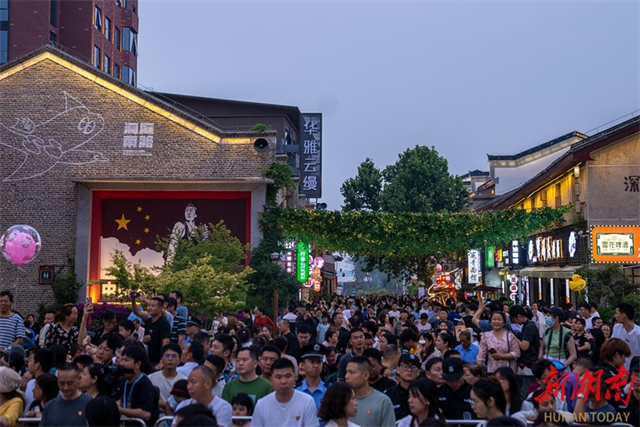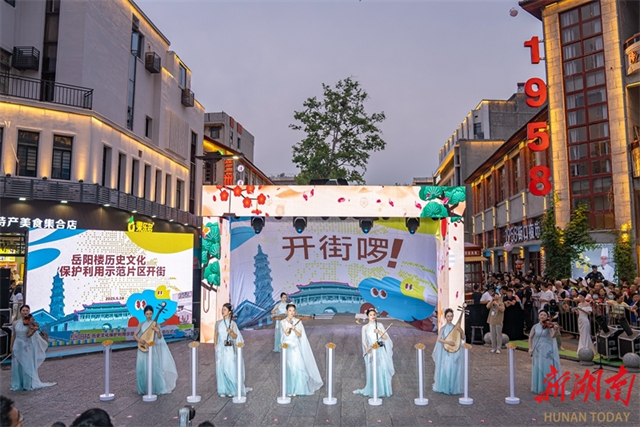On the evening of May 24, the Demonstration Zone for Historical and Cultural Protection and Utilization of Yueyang Tower opened in Yueyang City. The demonstration zone consists of historical downtown areas and historical and cultural neighborhoods. As a core project of the 4th Hunan Tourism Development Conference, it demonstrates the unique city style of "Beautiful Dongting Lake and Splendid Yueyang Tower". There are now 59 historical and 118 traditional buildings renovated in the zone, with 73 cultural and creative artistic stores, intangible cultural heritage workshops, immersive performing arts, and other characteristic business formats established. The zone will be built into a whole chain of consumption scenarios, integrating landscapes, stores, and alleys with traditional styles and historical memories. (Photo/Tong Zhenxi, Hunan Daily)