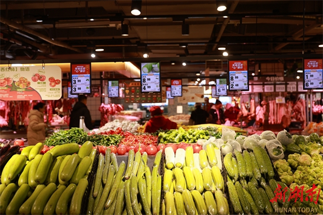 On January 20, the shelves were packed with an array of fresh vegetables, fruits, meat, and poultry at a supermarket in Tongdao Dong Autonomous County. In response to the recent freezing cold wave, the county authority has actively ensured the supply of daily necessities for residents. Vegetables, meat, cooking oil, and other goods remain plentiful and stable in price at farmers' markets, supermarkets, and shopping malls. (Photo/Shi Menglei)