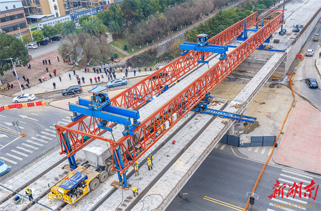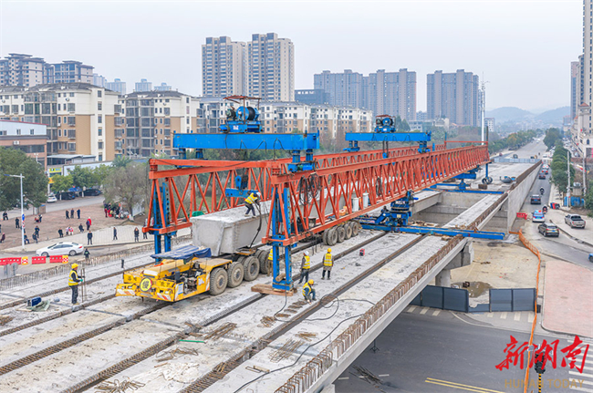 The "at-grade to grade-separated" intersection construction project of Guantian Road and Hunan-Guangxi Railway in Dong'an County completed box girder installation of the 280-meter-long overpass bridge on January 29, achieving a critical milestone. This project is a key project related to people's livelihood in Dong'an County. The main route is constructed according to urban arterial road standards, with the bridge spanning 280 meters in length and 16 meters in width. Upon completion, it will enhance traffic safety and efficiency significantly. (Photo/Cai Xiaoping)