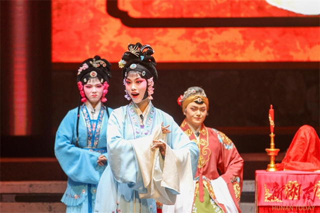 The photo, taken on the evening of January 4, shows artists staging a traditional flower-drum opera performance. That night, the graduation showcase of the five-year Flower-drum Opera Program trainees took place at the Zixing City Theater. The targeted training program is commissioned by Zixing City and undertaken by the Hunan Vocational College of Art. Fifteen flower-drum opera newcomers performed alongside veteran artists from the Zixing City Cultural Center, presenting a classic Flower-drum Opera performance that showcased the unique charm of traditional art and promoted the traditional virtues of loyalty, filial piety, chastity, and righteousness. (Photo/Li Qianghui and He Honghai)