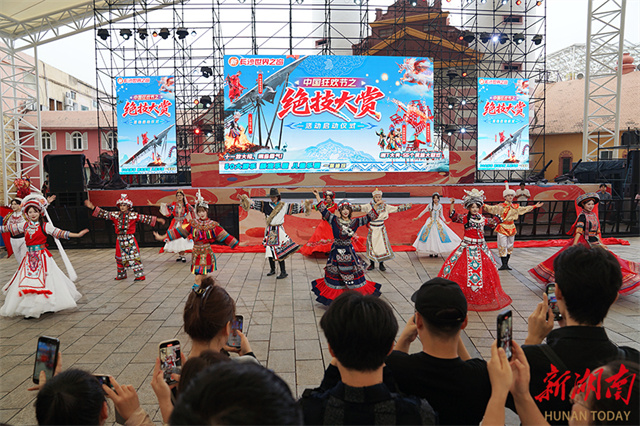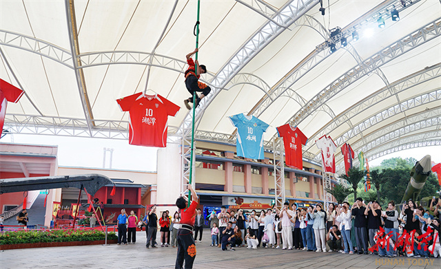 On September 29, a National Day celebration featuring spectacular skills kicked off at the Window on the World, Changsha. Intangible cultural heritage performances such as the duo high-pole stunts and Miao ethnic group's "Walking on Blades" were staged one after another. Joining spherical cinema, and other modern tech experiences, they created a festive feast that blends tradition and innovation for tourists. (Photo/Xu Xing, Hunan Daily)