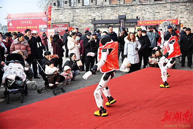 On January 28, people watched a robot dance performance during the Sixth "Lizhou Delicacies" New Year Fair and the Third Lizhou Confucius Temple Fair in Lixian County. This New Year event, blending technology with traditional culture, added a touch of modern artistic charm to traditional temple fair. (Photo/Bai Yipu and Wang Limei)