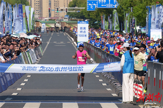 On April 19, the 2026 Yongzhou Marathon kicked off with great enthusiasm in Lengshuitan District, Yongzhou City. Tens of thousands of runners raced along the "one river, two banks" route, passing through city landmarks and intangible cultural heritage performing sites. The event helped the participants to fully immerse themselves in the urban charm of "New Yongzhou, Wonderful Yongzhou, Beautiful Yongzhou, and Blessed Yongzhou," effectively driving a surge in cultural and tourism consumption. The photo shows a participant is about to cross the finish line. (Photo/Lei Zhongxiang and Jiang Lingzhi)