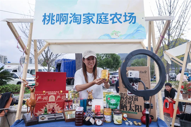 Xia Yue, a well-known agricultural entrepreneur, promotes local products during a livestream at a market in Jiande, east China's Zhejiang Province. (Photo/Xu Yu)