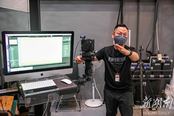 A working staff of the Changsha Museum photographic studio introduces the relics photography facilities.