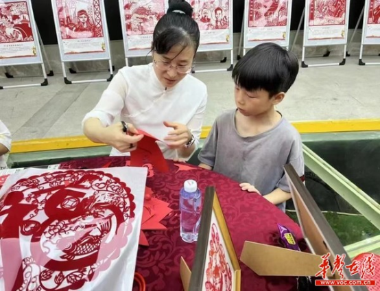 An inheritor of the art of paper cutting, a Chinese intangible cultural heritage, instructs a tourist in learning about Duanwu customs through paper-cutting at the Shaoyang Baishui Cave Scenic Area (Photo courtesy of the Shaoyang Baishui Cave Scenic Area)