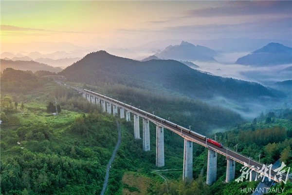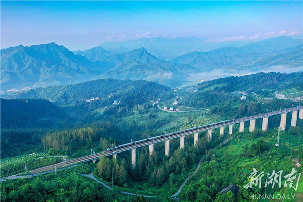 The photo, taken on July 30th, shows a train running on the No.1 Grand Bridge, a part of the Qianjiang-Zhangjiajie-Changde Railway, at Cheshu Village, Hongyanxi Town, Longshan County. Linking the Qianjiang District in Chongqing, and Zhangjiajie and Changde in Hunan, the Qianjiang-Zhangjiajie-Changde Railway stretches through high mountains in the Wuling Mountain Areas in the Hunan-Hubei-Chongqing provincial border area. It plays a significant role in promoting local transportation, facilitating the local economic development and rural revitalization, and benefitting local people. (Photo/ Zeng Xianghui)