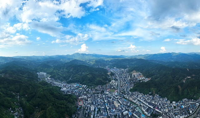 The photo above, taken on August 15, shows Guidong County under the blue sky and white clouds. It is a mountainous county located at the southern end of the Luoxiao mountain range, with an average altitude of 890 meters, a forest coverage rate of 85%, an average summer temperature of 23.7°C, and the concentration of negative oxygen ions far exceeding the average. In recent years, it has become a well-known health care, tourism, and summer resort. (Photo/Li Jian, Hunan Daily)