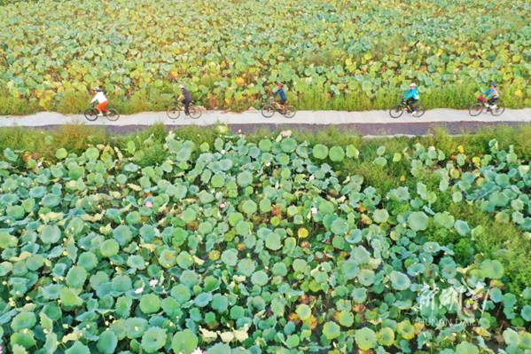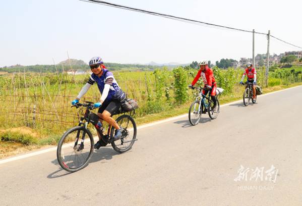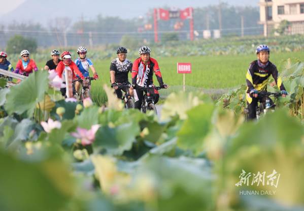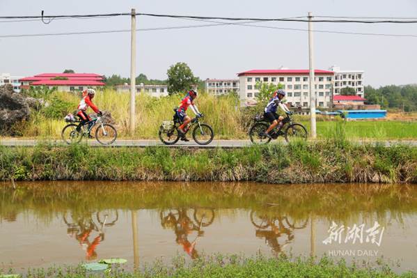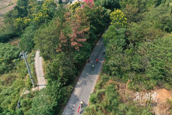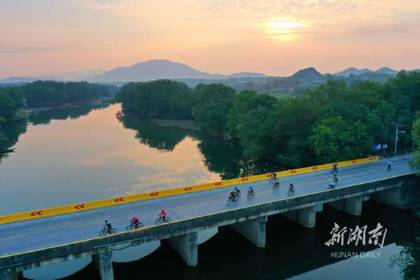 The World Cycling Day falls on September 17 every year. The photo shows amateur cyclists riding on a path through Guitou Village, Meihua Town, Daoxian County on early morning that day. They enjoyed sports and sightseeing while calling for low-carbon and green travel. (Photo/He Hongfu)
