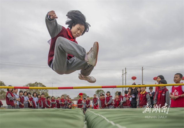 On October 30, students participated in the high jump competition at the sports meeting in Daozhou Yutan School, Daoxian County. In recent years, the school has organized various physical activities to help students foster sports awareness and grow stronger and healthier. (Photo/Jiang Keqing and Li Qingcui)