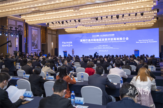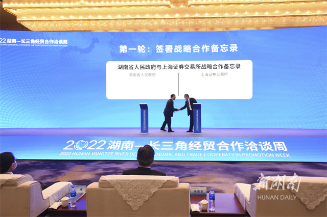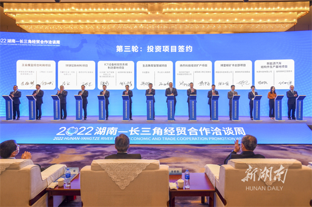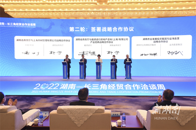 The 2022 Hunan-Yangtze River Delta Economic and Trade Cooperation Promotion Week opened in Shanghai on November 3. Four rounds of project signing were arranged at the Promotion Conference for Hunan as a Reform and Opening-up Pacesetter held on the same day. Four strategic cooperation agreements and 14 projects were inked on site. A total of 88 provincial-level projects were scheduled for the promotion week this year, with a total investment of 93.588 billion yuan, covering intelligent equipment manufacturing, new materials, new energy, biomedicine, and other fields. (Photo/Gu Pengbo and Huang Tingting, Hunan Daily)