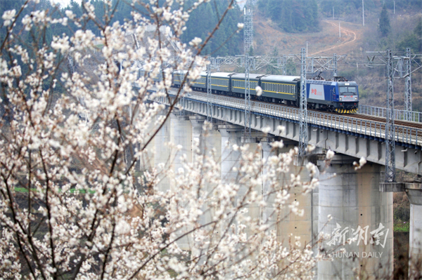 The photo, taken on March 2, shows a train running on the No.2 Bridge in Cheshu Village, Hongyanxi Town, Longshan County. The bridge is a part of the Qianyang-Zhangjiajie-Changde Railway. Recently, flowers are blooming in Wuling mountainous area. The railway is adorned with beautiful flowers, creating a stunning visual as the train passes through a sea of blossoms. (Photo/Zeng Xianghui)
