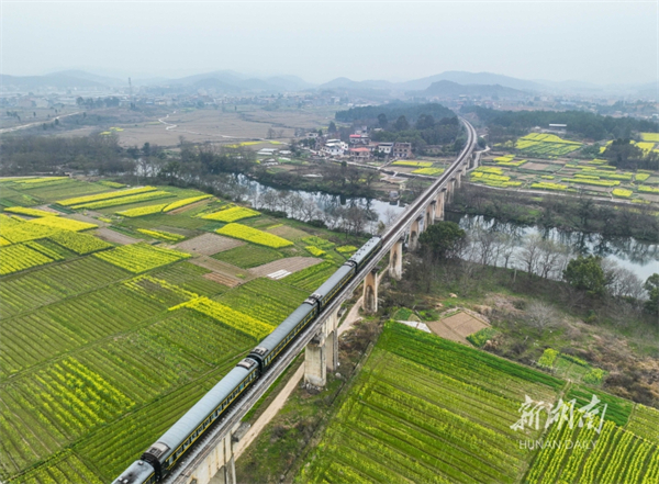 The photo, taken on March 2, shows a spectacular spring scenery of blossoming canola fields, a railway line, lucid water, and lush mountains in Jiangnan Village, Meihua Town, Daoxian County. (Photo/Jiang Keqing and Li Haozhang)
