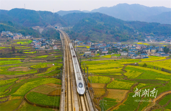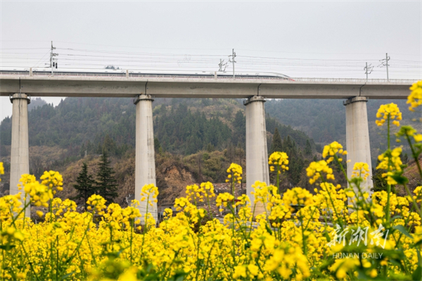 The photo, taken on March 2, shows a bullet train whizzing on the Zhangjiajie-Jishou-Huaihua High-speed Railway in Shuangtang Neighborhood, Jishou City. The canola blossoms along the railway are blooming, making a picturesque spring scene. (Photot/Zhang Shujie)