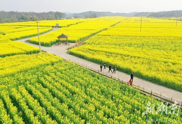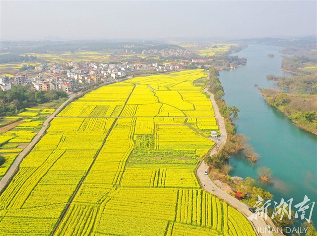 Canola flowers are blooming at Lianghekou Village in Xianglinpu Town, Daoxian County. The fields are blanketed with golden canola flowers. The blossoms, a winding river, and rural houses together present a picturesque rural scene, attracting many tourists. (Photo/He Hongfu)