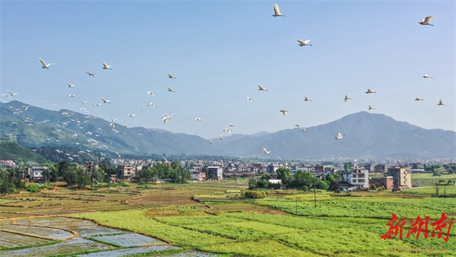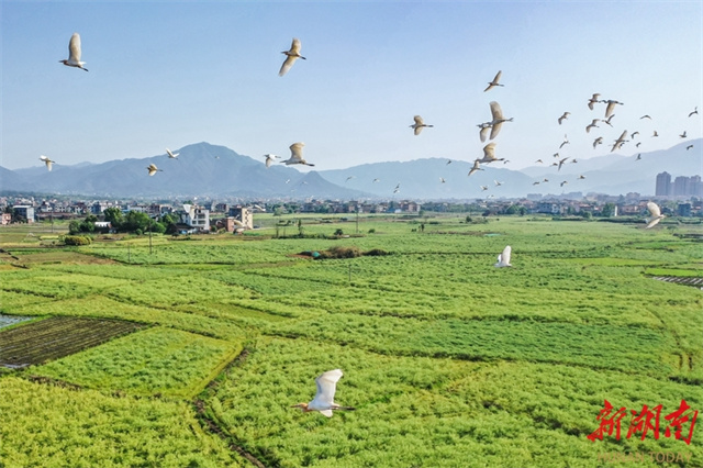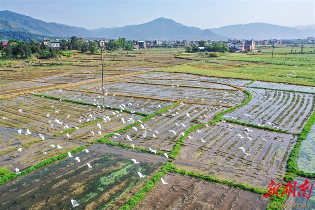 The photo, taken on April 16, shows beautiful natural scenery of a flock of egrets flying over and foraging in the fields of Shunshui Village, Tafeng Town, Lanshan County. (Photo/Peng Hua)