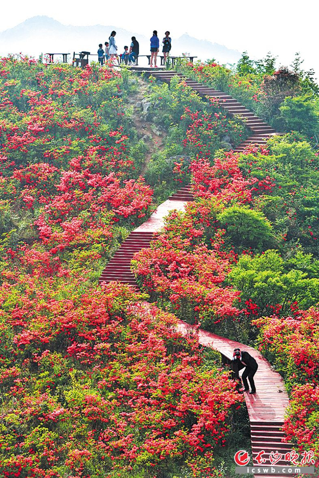 Tourists enjoy themselves amid a sea of azalea flowers on Dawei Mountain. (File photo/Li Feng, Changsha Evening News)