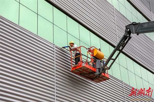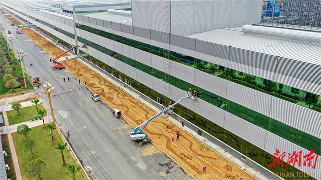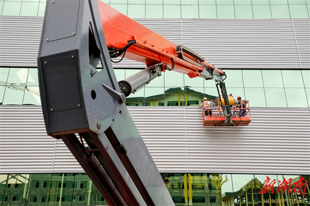 The photo, taken on May 5, shows construction workers installing glasses on the exterior of the main factory building at the construction site of Hunan Luli Green New Material Sci-tech Industrial Park project in Xintian County Industrial Development Zone. It is a provincial key project with a total investment of six billion yuan. Its first phase is expected to be completed and put into operation by the end of this year. Therefore, an industrial chain featuring log processing, wood sheet production, and furniture manufacturing will come into being. (Photo/Zhong Weifeng)