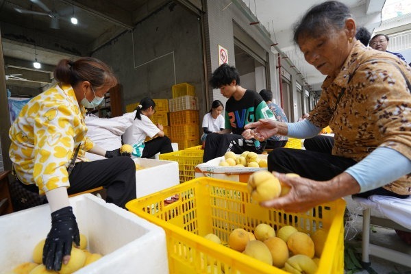The photo, taken on July 27, shows villagers sorting yellow peaches at a yellow peach trading market in Shuikou Town, Yanling County. (Photo/Zhang Mi, Hunan Daily)
