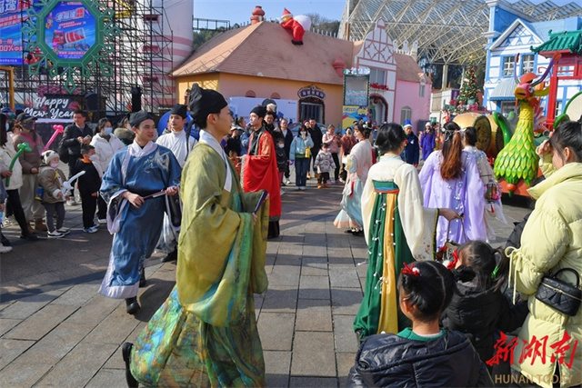 On December 24, the Window on the World in Changsha launched a China-chic carnival to celebrate the coming new year. A variety of activities were held, including an ancient costumes show, a float parade, snow-making, and the giving of Spring Festival couplets. The park brims with jubilant atmosphere as the new year nears. The photo, taken on December 24, shows tourists enjoying an ancient Chinese costumes show at the Window on the World in Changsha. (Photo/Xu Xing, Hunan Daily)