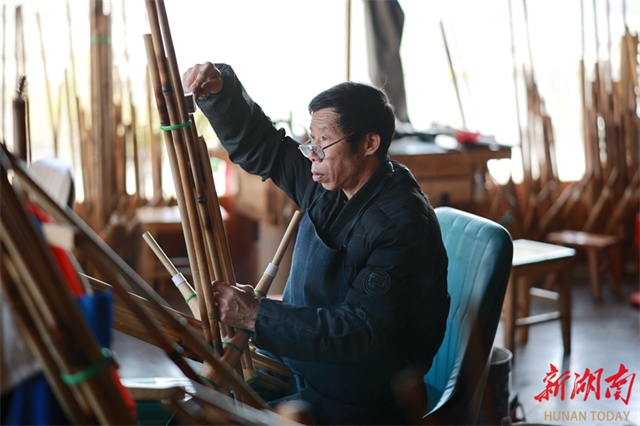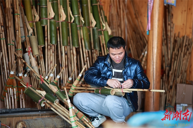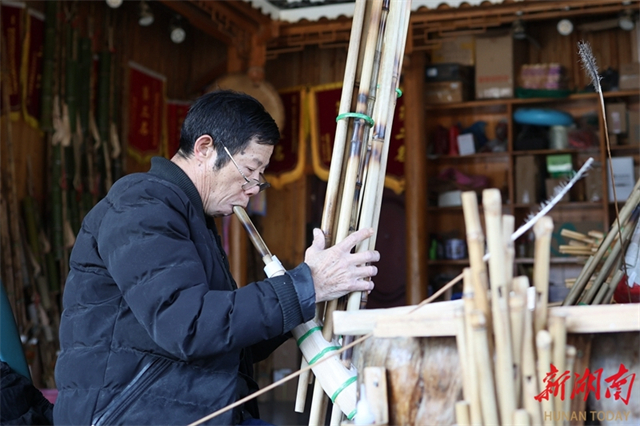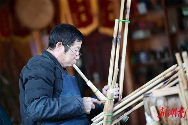 On December 25, a craftsman made lusheng, a reed-pipe musical instrument, at the intangible cultural heritage employment workshop in Sasu Square, Shuangjiang Town, Tongdao Dong Autonomous County. In recent years, the county authority has been taking various measures to promote the protection, inheritance, and development of intangible cultural heritage. It has set up intangible cultural heritage inheritance and study bases, strengthened cultivation of intangible cultural heritage personnel, and revitalized combination of intangible cultural heritage and market, which has resulted in increased income for the local community. (Photo/Li Shangyin)