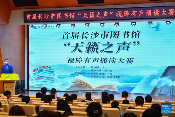 This photo taken on April 23, 2024 shows a view of the audio reading competition for visually impaired people at Changsha Library in Changsha, central China's Hunan province. In recent years, Changsha Library has created an accessible reading environment for the visually impaired. The specially designed reading room has more than 10,000 volumes of braille books and journals, over 1,000 audio books and more than 300 accessible movies. Additionally, the library has been equipped with reading devices for the visually impaired, such as screen reading software, braille printers and visual aids. The library has also organized cultural activities to bring the joy of reading to the visually impaired group. (Xinhua/Chen Zeguo)