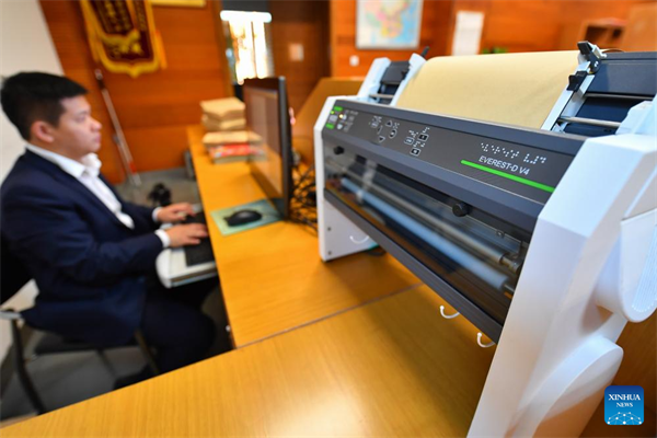 Yao Shenglong, a staff member of Changsha Library, makes braille materials for visually impaired people at Changsha Library in Changsha, central China's Hunan province, April 23, 2024. In recent years, Changsha Library has created an accessible reading environment for the visually impaired. The specially designed reading room has more than 10,000 volumes of braille books and journals, over 1,000 audio books and more than 300 accessible movies. Additionally, the library has been equipped with reading devices for the visually impaired, such as screen reading software, braille printers and visual aids. The library has also organized cultural activities to bring the joy of reading to the visually impaired group. (Xinhua/Chen Zeguo)