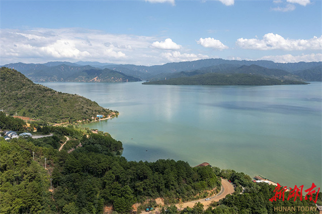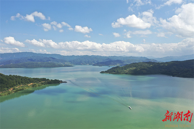 The photo shows a beautiful scene composed of clear waters, blue skies, white clouds, and lush hills at the Dongjiang Lake Scenic Area in Zixing City. The scenic area was temporarily closed on July 27 due to heavy rainfall caused by Typhoon Gaemi. Now the tourist attraction has gradually resumed operation from August 8. The little Dongjiang Scenic Spot opens its No. 2, No. 3, and No. 4 platforms, while the No. 1 platform and one part of the tourist trail in the Longjing Canyon Scenic Spot remain closed. (Photo/Liang Keting, Hunan Daily)
