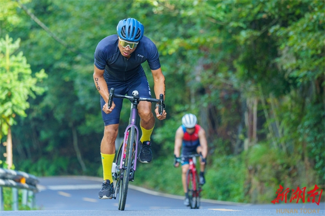 The 2024 Mangshan Mountain Scenic Area Triathlon kicked off at the Mangshan Mountain National Forest Park on August 25. The triathlon included a 1.5-km swimming segment, a 15-km cycling climbing portion, and a 4.2-km running race, with a total elevation gain of nearly 1,000 meters throughout the course. During the competition, the athletes enjoyed the thrill of competitive sports while appreciating the picturesque landscapes of Mangshan Mountain and the fresh air along the triathlon route. The photo shows athletes competing in the cycling climbing event on that day. (Photo/Deng Jialiang)