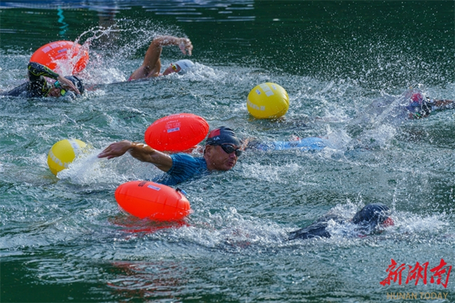 The 2024 Mangshan Mountain Scenic Area Triathlon kicked off at the Mangshan Mountain National Forest Park on August 25. The triathlon included a 1.5-km swimming segment, a 15-km cycling climbing portion, and a 4.2-km running race, with a total elevation gain of nearly 1,000 meters throughout the course. During the competition, the athletes enjoyed the thrill of competitive sports while appreciating the picturesque landscapes of Mangshan Mountain and the fresh air along the triathlon route. The photo shows athletes competing in the swimming event on that day. (Photo/Deng Jialiang)