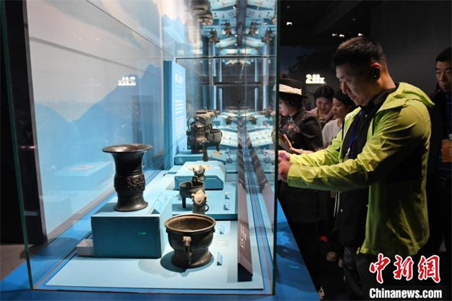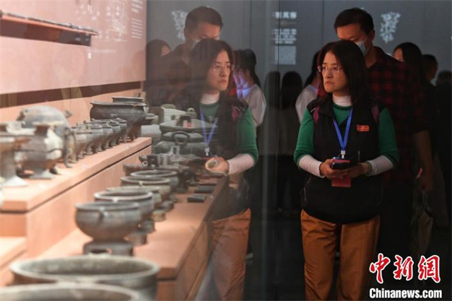 The photo shows overseas Chinese media representatives observing bronze wares. (Photo/Yang Huafeng, Chinanews)