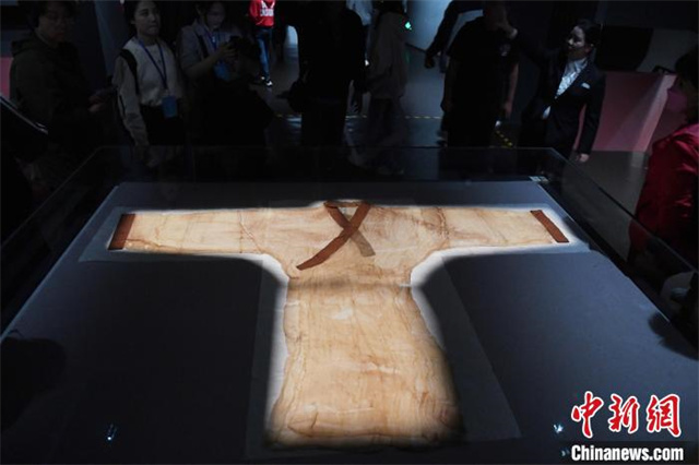 The photo shows overseas Chinese media representatives and tourists viewing the Susha Danyi or plain unlined gauze gown which was unearthed from the Mawangdui Tombs. (Photo/Yang Huafeng, Chinanews)