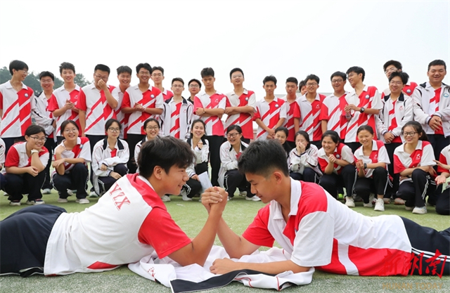 On May 27, two senior students competed in arm wrestling on the playground at Yueyun Middle School, Hengshan County. As the college entrance examination approaches, the school carried out a variety of fun games for senior students during their morning exercises. This aimed to help students relax and face the college entrance examination with a relaxed, optimistic, and confident mindset. (Photo/Cao Zhengping and Xia Jianjun)