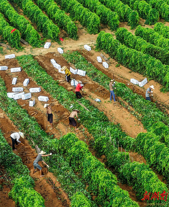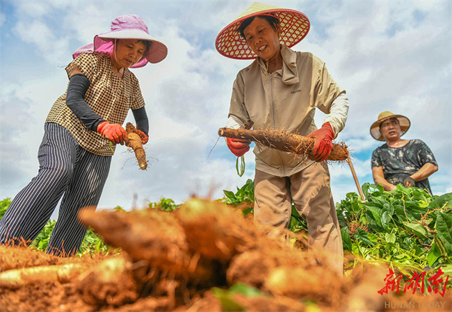 In recent years, Daoxian County has been guiding local farmers to utilize the mountain resource to cultivate Chinese yam, kudzu root, and other specialty crops. This initiative aims to enhance agricultural efficiency, increase farmers' income, and boost rural revitalization. The photo, taken on September 8, shows villagers harvesting Chinese yams at Dongwei Village, Xianglinpu Town, Daoxian County. (Photo/Jiang Keqing)