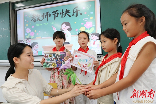 Today marks China's 41st Teachers' Day. On this occasion, students of Qingshuiping School in Baojing County express profound respect and sincere wishes to their teachers through various forms, such as designing handcrafted posters, reciting poems, and presenting flowers. The photo, taken on September 9, shows students presenting a handcrafted gift to their teacher. (Photo/Tian Rurui)