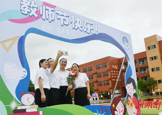 Today marks China's 41st Teachers' Day. On this occasion, students of Siyuan Experimental School in Jiangyong County express profound respect and sincere wishes to their teachers through various forms, such as designing handcrafted posters, reciting poems, and presenting flowers. The photo, taken on September 9, shows teachers taking group photos. (Photo/Tian Rurui)
