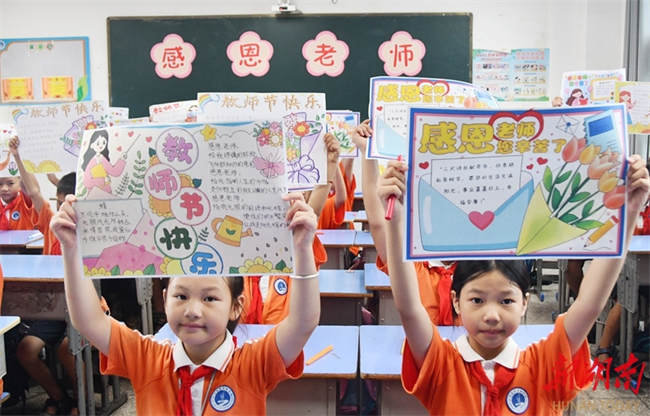 Today marks China's 41st Teachers' Day. On this occasion, students of Siyuan Experimental School in Jiangyong County express profound respect and sincere wishes to their teachers through various forms, such as designing handcrafted posters, reciting poems, and presenting flowers. The photo, taken on September 9, depicts students showing their handcrafted posters. (Photo/Tian Rurui)