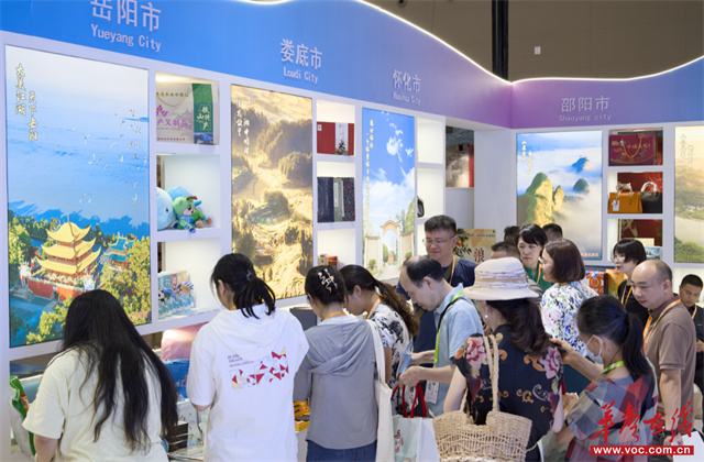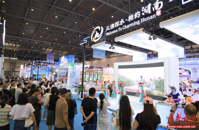Within the Hunan Pavilion, a range of intangible cultural heritage products and cultural tourism commodities with distinctive Hunan characteristics were on diplay, such as Xiang embroidery, Liuyang fireworks, chrysanthemum stone carvings, Liling porcelain, Miao embroidery, Tujia brocade, Nvshu works, and Anhua dark tea, which attracted numerous visitors who stopped to admire them. The pavilion also came alive with a series of performances, including the group dance "Yao Village Charm," the flower-drum opera "Liu Hai Cuts Firewood," the solo song "Spicy Girl," and the interactive parade "Elegance of Tang Dynasty."