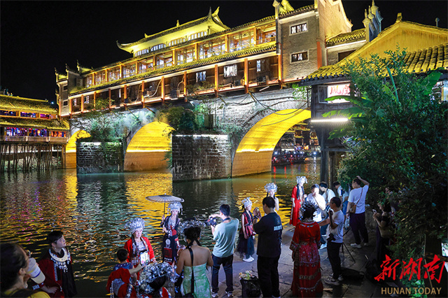 The banks of the Tuojiang River in Fenghuang Ancient Town were illuminated by brilliant lights. Tourists enjoyed boat rides at night, stopped to take photos, and fully immersed themselves in the town's nightscape. During the National Day holiday, the scenic area introduced new nighttime tourism activities, allowing visitors to fully experience the folk culture of western Hunan and its beautiful natural scenery. (Photo/Teng Shuming)