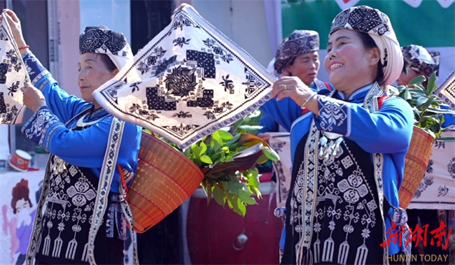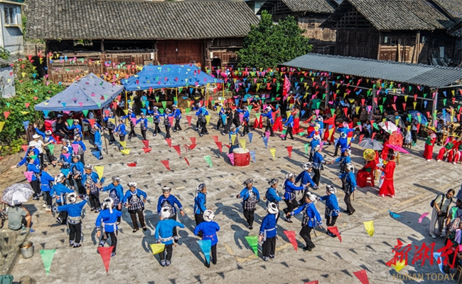 Villagers perform a Tiaoxiang dance at Daxing Village, Danqing Town, Jishou City on October 9. The village hosted a public art performance themed "celebrate bumper harvest, showcase a new look" on that day. Art troupes from the village and neighboring villages presented 56 self-choreographed programmes, including square dances, folk song performances, and intangible cultural heritage shows. The event conveyed people's joy of harvest and highlighted the prosperous, fulfilled, and positive spirit of farmers in the new era. (Photo/Yao Fang and Zhang Deping)